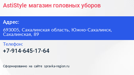 AstiStyle, магазин головных уборов по адресу 693005, Сахалинская область, Южно-Сахалинск, Сахалинская, 89 в дальнейшем Организация, размещена в следующих категориях: