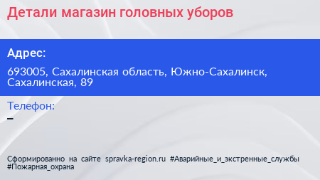 Детали, магазин головных уборов по адресу 693005, Сахалинская область, Южно-Сахалинск, Сахалинская, 89 в дальнейшем Организация, размещена в следующих категориях: