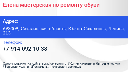 Елена, мастерская по ремонту обуви по адресу 693009, Сахалинская область, Южно-Сахалинск, Ленина, 213 в дальнейшем Организация, размещена в следующих категориях: