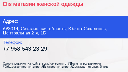Elis, магазин женской одежды по адресу 693014, Сахалинская область, Южно-Сахалинск, Центральная 2-я, 1Б в дальнейшем Организация, размещена в следующих категориях: