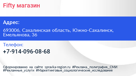 Fifty, магазин по адресу 693006, Сахалинская область, Южно-Сахалинск, Емельянова, 36 в дальнейшем Организация, размещена в следующих категориях: