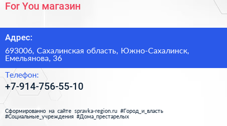 For You, магазин по адресу 693006, Сахалинская область, Южно-Сахалинск, Емельянова, 36 в дальнейшем Организация, размещена в следующих категориях: