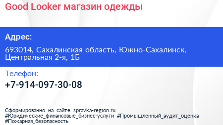 Good-Looker, магазин одежды по адресу 693014, Сахалинская область, Южно-Сахалинск, Центральная 2-я, 1Б в дальнейшем Организация, размещена в следующих категориях: