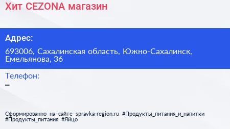 Хит CEZONA, магазин по адресу 693006, Сахалинская область, Южно-Сахалинск, Емельянова, 36 в дальнейшем Организация, размещена в следующих категориях: