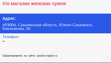 Iris, магазин женских сумок по адресу 693006, Сахалинская область, Южно-Сахалинск, Емельянова, 36 в дальнейшем Организация, размещена в следующих категориях: