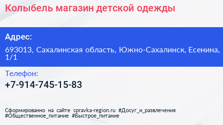 Колыбель, магазин детской одежды по адресу 693013, Сахалинская область, Южно-Сахалинск, Есенина, 1/1 в дальнейшем Организация, размещена в следующих категориях: