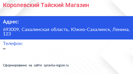 Королевский Тайский Магазин по адресу 693009, Сахалинская область, Южно-Сахалинск, Ленина, 123 в дальнейшем Организация, размещена в следующих категориях: