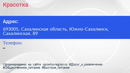 Красотка по адресу 693005, Сахалинская область, Южно-Сахалинск, Сахалинская, 89 в дальнейшем Организация, размещена в следующих категориях:
