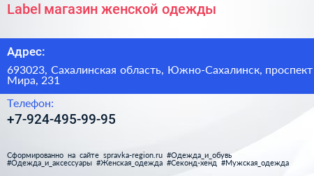 Label, магазин женской одежды по адресу 693023, Сахалинская область, Южно-Сахалинск, проспект Мира, 231 в дальнейшем Организация, размещена в следующих категориях: