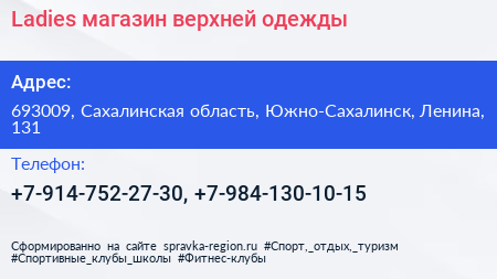 Ladies, магазин верхней одежды по адресу 693009, Сахалинская область, Южно-Сахалинск, Ленина, 131 в дальнейшем Организация, размещена в следующих категориях: