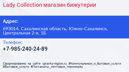 Lady Collection, магазин бижутерии по адресу 693014, Сахалинская область, Южно-Сахалинск, Центральная 2-я, 1Б в дальнейшем Организация, размещена в следующих категориях: