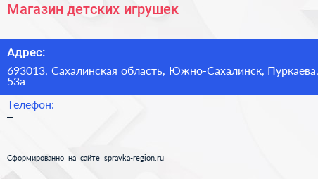 Магазин детских игрушек по адресу 693013, Сахалинская область, Южно-Сахалинск, Пуркаева, 53а в дальнейшем Организация, размещена в следующих категориях: