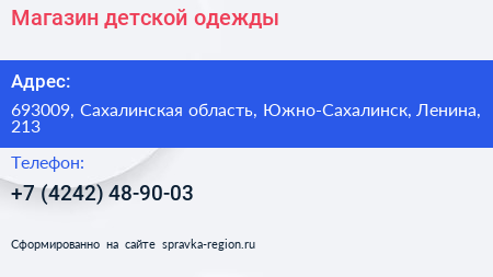 Магазин детской одежды по адресу 693009, Сахалинская область, Южно-Сахалинск, Ленина, 213 в дальнейшем Организация, размещена в следующих категориях: