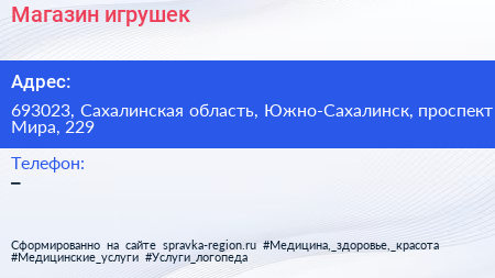 Магазин игрушек по адресу 693023, Сахалинская область, Южно-Сахалинск, проспект Мира, 229 в дальнейшем Организация, размещена в следующих категориях: