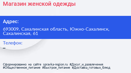 Магазин женской одежды по адресу 693009, Сахалинская область, Южно-Сахалинск, Сахалинская, 61 в дальнейшем Организация, размещена в следующих категориях:
