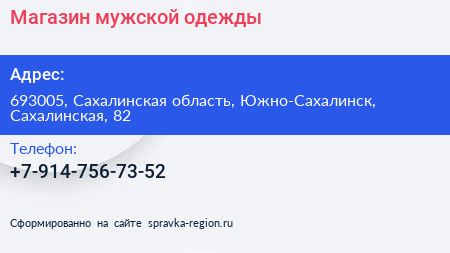 Магазин мужской одежды по адресу 693005, Сахалинская область, Южно-Сахалинск, Сахалинская, 82 в дальнейшем Организация, размещена в следующих категориях: