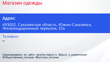 Магазин одежды по адресу 693022, Сахалинская область, Южно-Сахалинск, Железнодорожный переулок, 15а в дальнейшем Организация, размещена в следующих категориях: