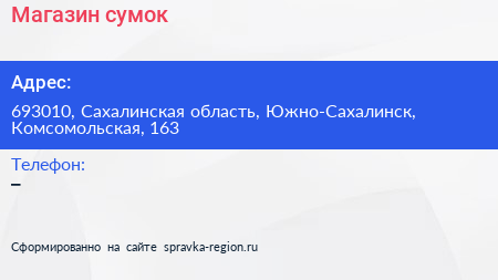 Магазин сумок по адресу 693010, Сахалинская область, Южно-Сахалинск, Комсомольская, 163 в дальнейшем Организация, размещена в следующих категориях:
