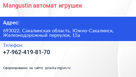 Mangustin, автомат игрушек по адресу 693022, Сахалинская область, Южно-Сахалинск, Железнодорожный переулок, 15а в дальнейшем Организация, размещена в следующих категориях: