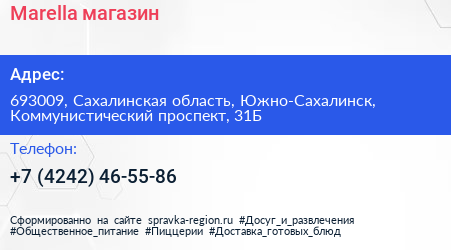 Marella, магазин по адресу 693009, Сахалинская область, Южно-Сахалинск, Коммунистический проспект, 31Б в дальнейшем Организация, размещена в следующих категориях:
