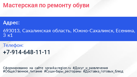 Мастерская по ремонту обуви по адресу 693013, Сахалинская область, Южно-Сахалинск, Есенина, 3 к1 в дальнейшем Организация, размещена в следующих категориях:
