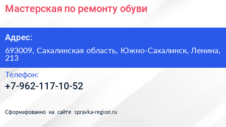 Мастерская по ремонту обуви по адресу 693009, Сахалинская область, Южно-Сахалинск, Ленина, 213 в дальнейшем Организация, размещена в следующих категориях: