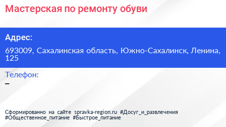 Мастерская по ремонту обуви по адресу 693009, Сахалинская область, Южно-Сахалинск, Ленина, 125 в дальнейшем Организация, размещена в следующих категориях: