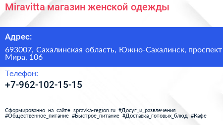Miravitta, магазин женской одежды по адресу 693007, Сахалинская область, Южно-Сахалинск, проспект Мира, 106 в дальнейшем Организация, размещена в следующих категориях: