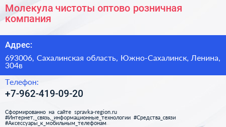 Молекула чистоты, оптово-розничная компания по адресу 693006, Сахалинская область, Южно-Сахалинск, Ленина, 304в в дальнейшем Организация, размещена в следующих категориях: