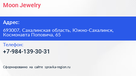 Moon Jewelry по адресу 693007, Сахалинская область, Южно-Сахалинск, Космонавта Поповича, 65 в дальнейшем Организация, размещена в следующих категориях: