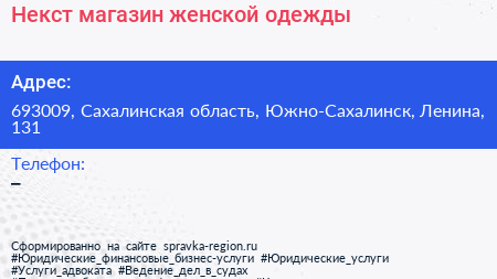 Некст, магазин женской одежды по адресу 693009, Сахалинская область, Южно-Сахалинск, Ленина, 131 в дальнейшем Организация, размещена в следующих категориях: