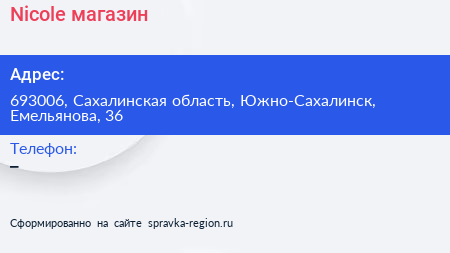 Nicole, магазин по адресу 693006, Сахалинская область, Южно-Сахалинск, Емельянова, 36 в дальнейшем Организация, размещена в следующих категориях: