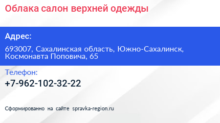 Облака, салон верхней одежды по адресу 693007, Сахалинская область, Южно-Сахалинск, Космонавта Поповича, 65 в дальнейшем Организация, размещена в следующих категориях: