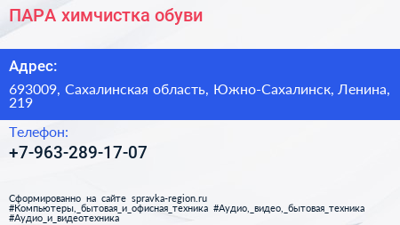ПАРА, химчистка обуви по адресу 693009, Сахалинская область, Южно-Сахалинск, Ленина, 219 в дальнейшем Организация, размещена в следующих категориях: