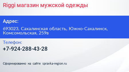 Riggi, магазин мужской одежды по адресу 693023, Сахалинская область, Южно-Сахалинск, Комсомольская, 259в в дальнейшем Организация, размещена в следующих категориях: