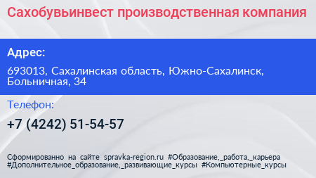 Сахобувьинвест, производственная компания по адресу 693013, Сахалинская область, Южно-Сахалинск, Больничная, 34 в дальнейшем Организация, размещена в следующих категориях: