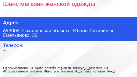 Шанс, магазин женской одежды по адресу 693006, Сахалинская область, Южно-Сахалинск, Емельянова, 36 в дальнейшем Организация, размещена в следующих категориях: