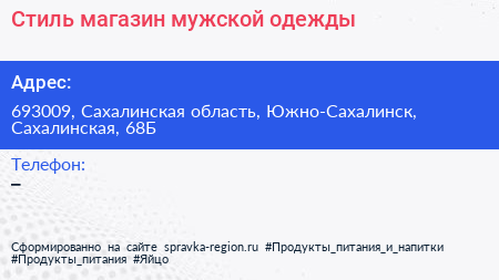 Стиль, магазин мужской одежды по адресу 693009, Сахалинская область, Южно-Сахалинск, Сахалинская, 68Б в дальнейшем Организация, размещена в следующих категориях: