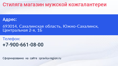 Стиляга, магазин мужской кожгалантереи по адресу 693014, Сахалинская область, Южно-Сахалинск, Центральная 2-я, 1Б в дальнейшем Организация, размещена в следующих категориях:
