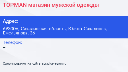 TOPMAN, магазин мужской одежды по адресу 693006, Сахалинская область, Южно-Сахалинск, Емельянова, 36 в дальнейшем Организация, размещена в следующих категориях: