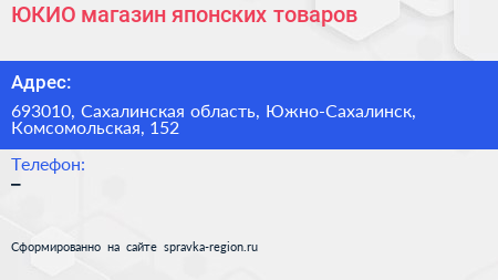ЮКИО, магазин японских товаров по адресу 693010, Сахалинская область, Южно-Сахалинск, Комсомольская, 152 в дальнейшем Организация, размещена в следующих категориях: