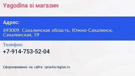 Yagodina si, магазин по адресу 693009, Сахалинская область, Южно-Сахалинск, Сахалинская, 59 в дальнейшем Организация, размещена в следующих категориях: