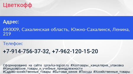 Цветкофф по адресу 693009, Сахалинская область, Южно-Сахалинск, Ленина, 219 в дальнейшем Организация, размещена в следующих категориях: