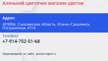 Аленький цветочек, магазин цветов по адресу 693006, Сахалинская область, Южно-Сахалинск, Пограничная, 47/6 в дальнейшем Организация, размещена в следующих категориях: