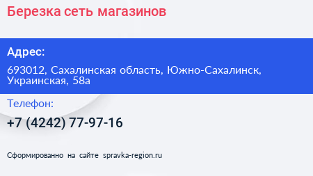 Березка, сеть магазинов по адресу 693012, Сахалинская область, Южно-Сахалинск, Украинская, 58а в дальнейшем Организация, размещена в следующих категориях: