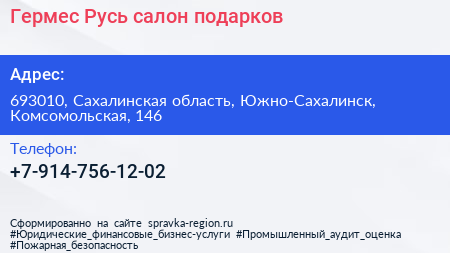 Гермес-Русь, салон подарков по адресу 693010, Сахалинская область, Южно-Сахалинск, Комсомольская, 146 в дальнейшем Организация, размещена в следующих категориях: