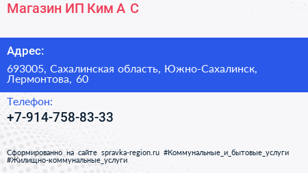 Магазин, ИП Ким А.С. по адресу 693005, Сахалинская область, Южно-Сахалинск, Лермонтова, 60 в дальнейшем Организация, размещена в следующих категориях: