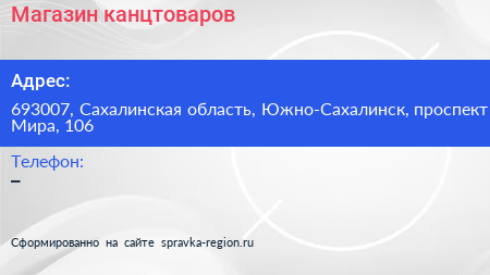 Магазин канцтоваров по адресу 693007, Сахалинская область, Южно-Сахалинск, проспект Мира, 106 в дальнейшем Организация, размещена в следующих категориях: