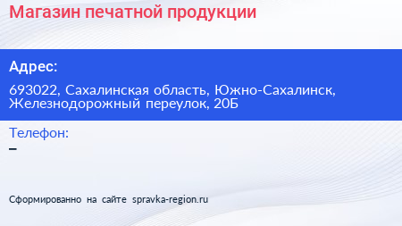 Магазин печатной продукции по адресу 693022, Сахалинская область, Южно-Сахалинск, Железнодорожный переулок, 20Б в дальнейшем Организация, размещена в следующих категориях: