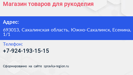 Магазин товаров для рукоделия по адресу 693013, Сахалинская область, Южно-Сахалинск, Есенина, 1/1 в дальнейшем Организация, размещена в следующих категориях: